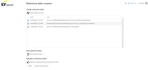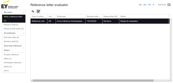 With a click on the logo on the left side you will get to the main page where you will find an overview of all reference letters assigned to you in the corresponding status.